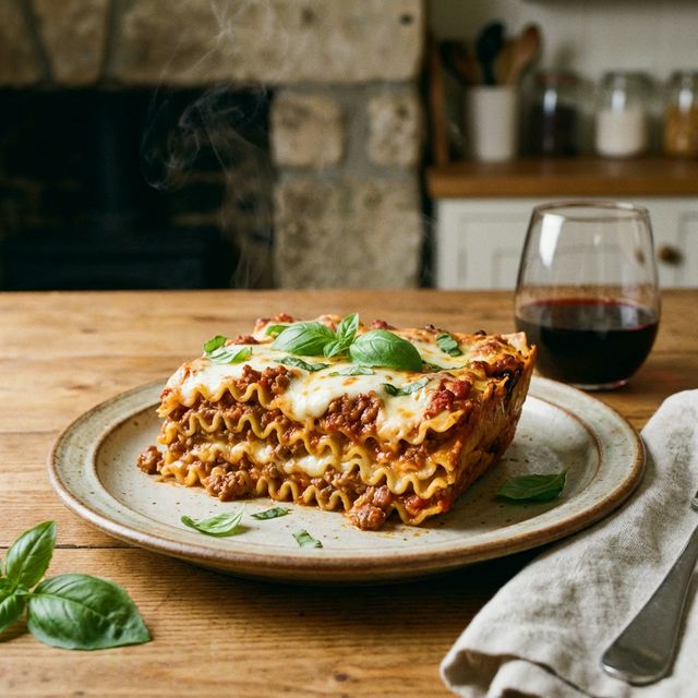 Lasagna with sweet sausage and a layer of basil leaves right underneath the cheese.