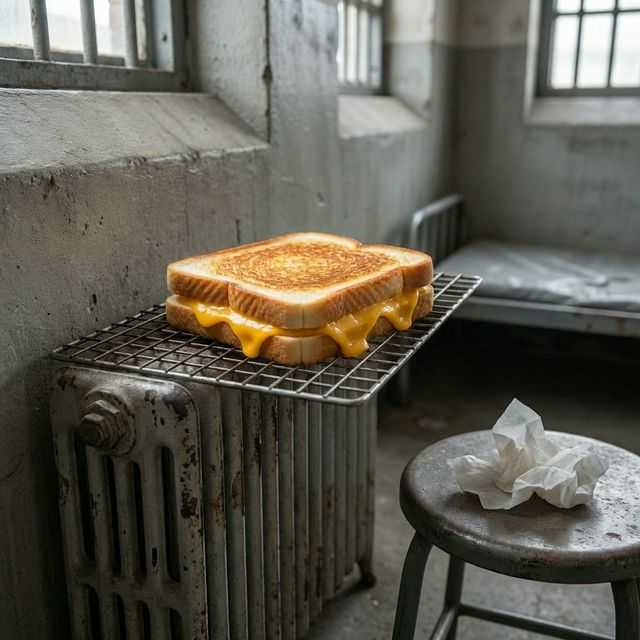 The 'Radiator' Method (Stove): Heat a pan on very low. Press the sandwich down. You want it to cook slowly, mimicking the gentle, frustrating heat of a prison radiator.